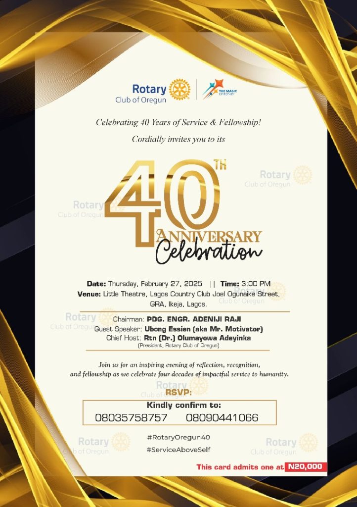 The School of Eloquence is excited to announce that Ubong Essien, CSP, will be the Guest Speaker for the Rotary Club of Oregon’s 40th Anniversary. The theme is “40 Years of Service & Fellowship.” The celebration occurs on Thursday, February 27, 2025, at the Little Theatre, Lagos Country Club in Ikeja.